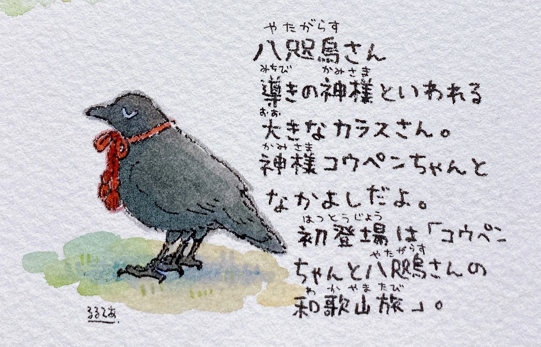 A large crow that is said to be the god of guidance. They’re good friends with God Koupen-chan. They debuted in “Koupen-chan and Yatagarasu-san’s Wakayama Journey.” (Translation here.)