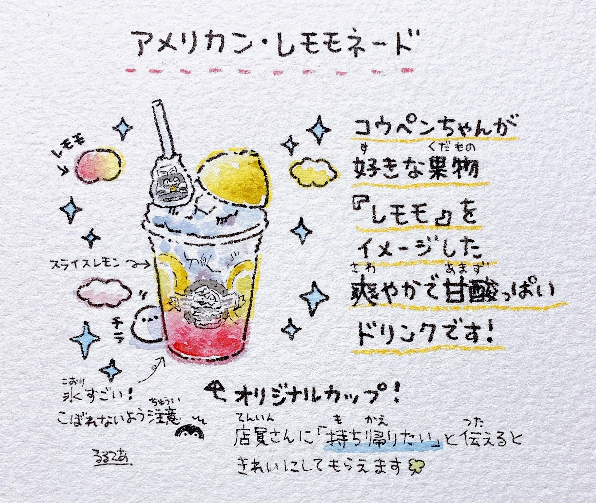 I tried drawing the “American Lemomonade” (Lemomo = Lemon-peach) since it is now available from the latter-period menu!