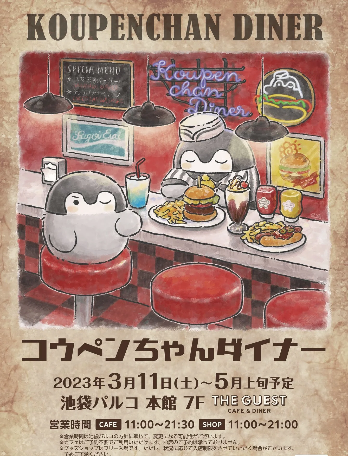 This collaboration is with Koupen-chan and a café/diner called THE GUEST, which has locations in multiple parts of Japan. It seems this particular collaboration will be held at the locations in the Tokyo and Aichi prefectures (Ikebukuro and Nagoya, respectively). Both locations are in PARCO department stores.