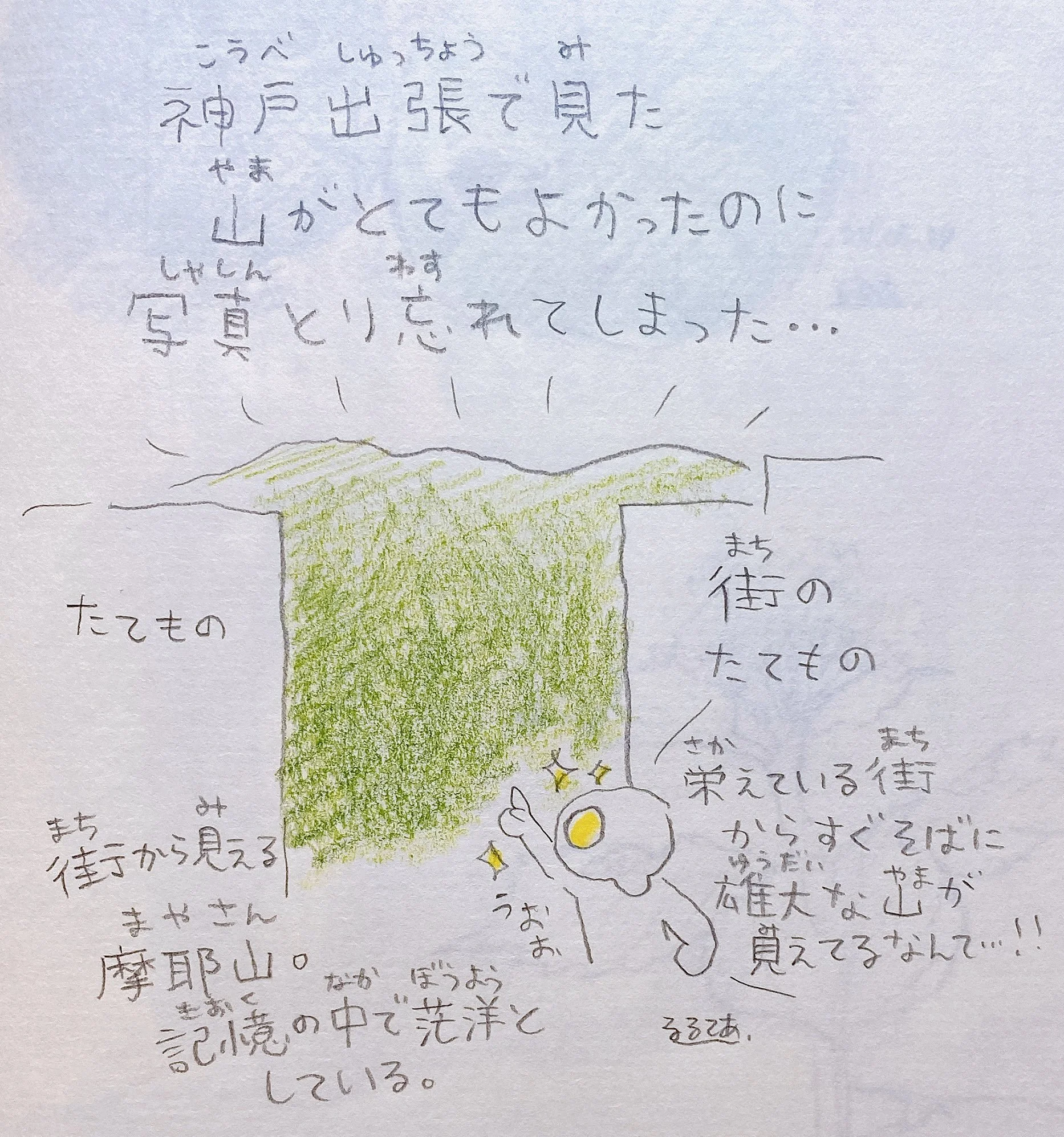 “The mountains I saw on my business trip to Kobe were really nice, but I forgot to take a picture… From the flourishing town, you can see the magnificent mountain that’s just nearby…! Uwooh“