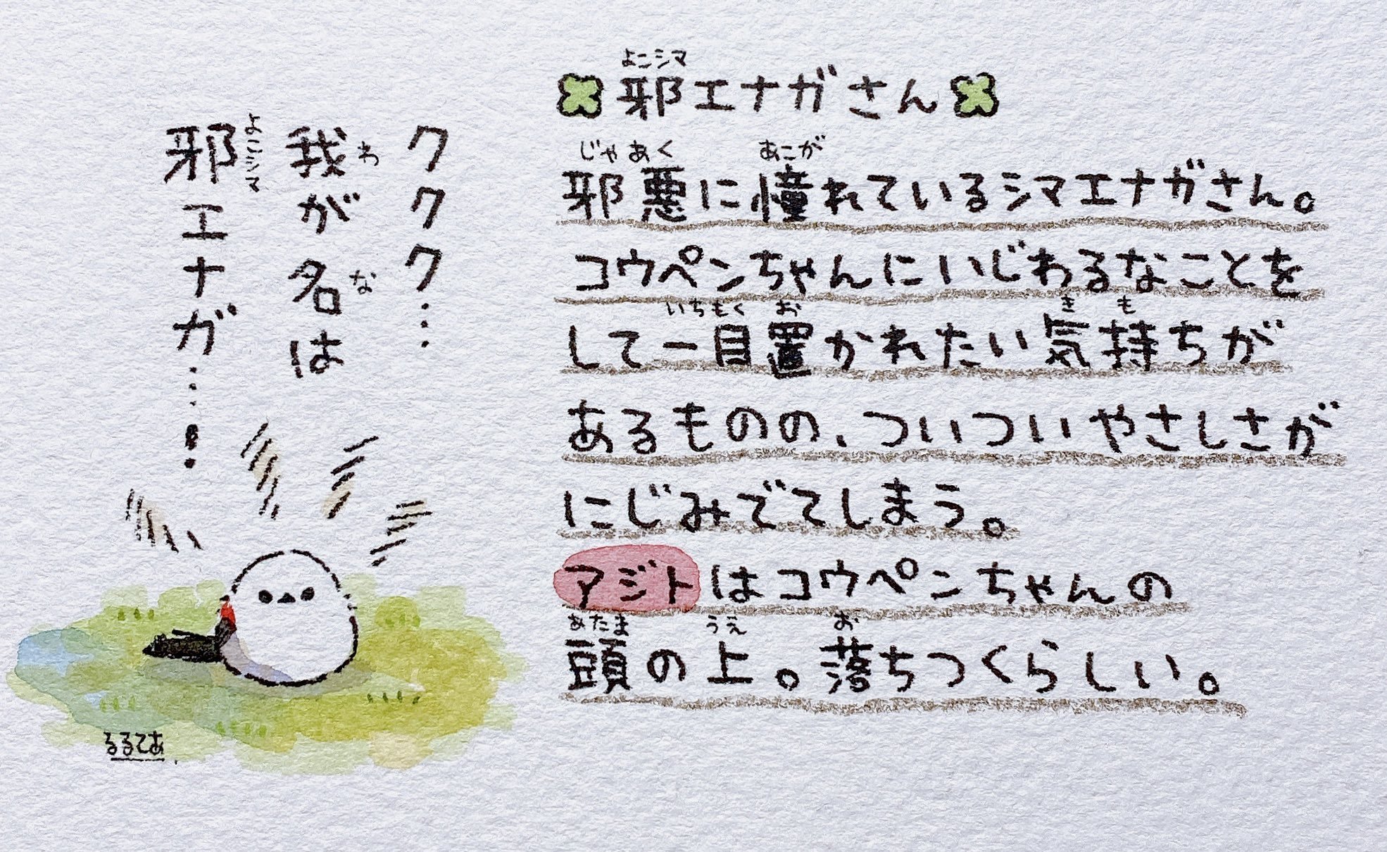 A Shima Enaga-san (long-tailed bushtit) who aspires to be evil. Although they say mean things to Koupen-chan and want others to bow down to them, they unintentionally let their kindness show through.
